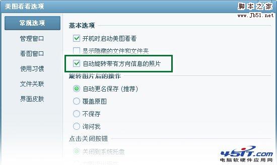 美图看看会根据图片的EXIF信息中记录的拍摄方向自动调整图片的显示方向,而部分其他看图软件不具备此功能。如果您希望关闭此功能,可在选项->常规选项卡中关闭此功能。