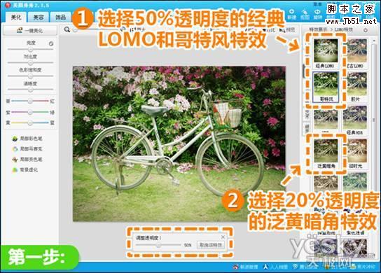 1、在“美图秀秀”中打开随拍照片。先使用透明度为50%的“经典LOMO”、50%的“哥特风”特效,然后再使用一个透明度为20%的“泛黄暗角”特效。