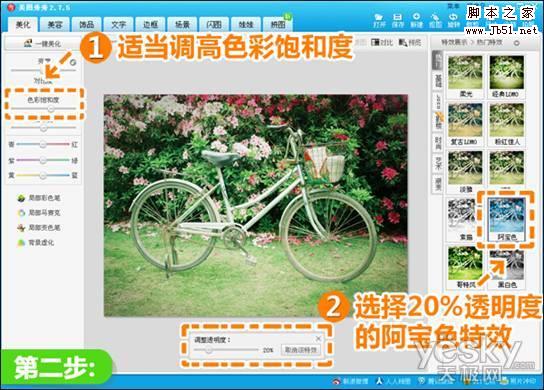 2、点击“热门”特效分类,选用透明度为20%的“阿宝色”特效。并适当调高照片色彩饱和度,使照片颜色亮丽。
