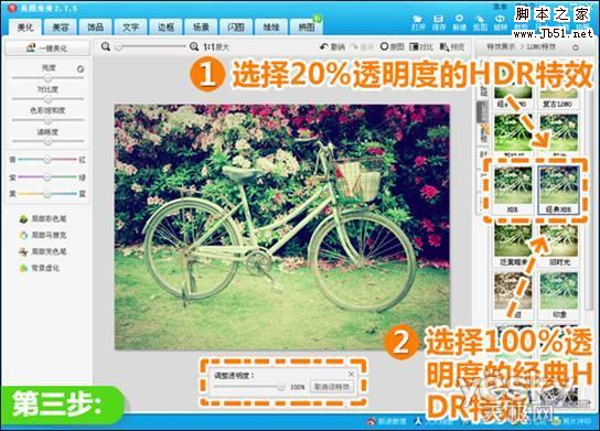 3、在“LOMO”特效分类中,分别使用透明的为20%的“HDR”和100%的“经典HDR”特效,为图片带来明暗对比效果。