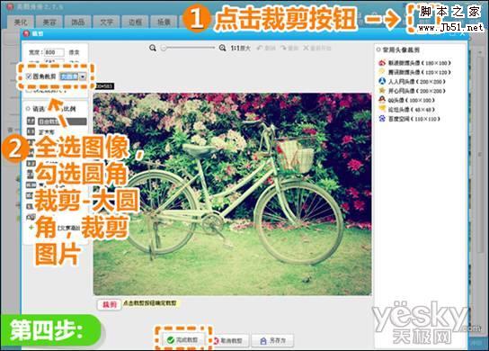 4、点击“裁剪”按钮,在弹出的“裁剪”编辑框中勾选“圆角裁剪?大圆角”,全选图像进行圆角裁剪。
