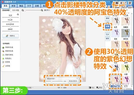 3、回到“美化”菜单下,点击“影楼”特效分类,使用透明度为40%的“阿宝色”以及30%的“紫色幻想”特效,让照片整体呈现梦幻感觉。