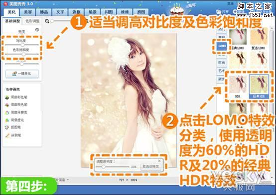 4、点击“LOMO”特效分类,使用透明度为60%的“HDR”以及20%的“经典HDR”特效。并适当调高照片对比度及色彩饱和度,让照片色彩更靓丽。