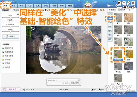 2、接下来就是调整色调,选择“基础-智能绘色”特效,让画面色彩明艳。