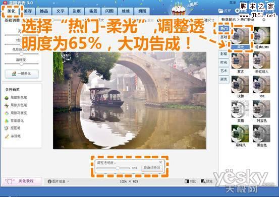 4、最后选择“热门-柔光”特效,调整透明度为65%,就大功告成啦!