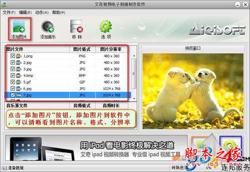 艾奇视频电子相册制作软件,支持JPG、GIF、BMP、PNG等常见图片格式,支持批量添加图片。