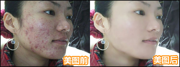 因为这个美女的痘痘非常严重,前两个步骤可能无法根除,这个时候我们需要借助于“消除黑眼圈”的功能。先来看看利用“消除黑眼圈”功能消灭痘痘前后的对比图吧: