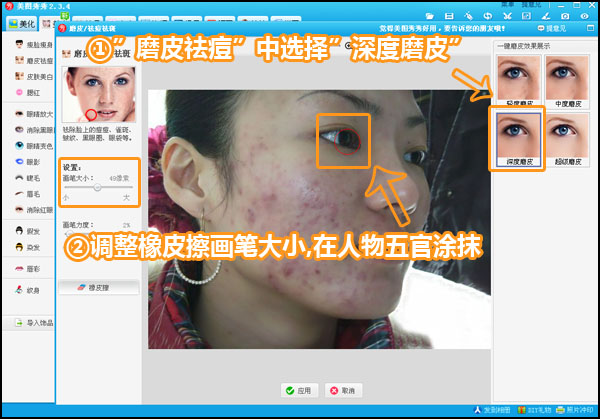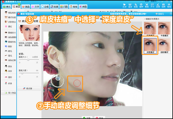 第一步:打开原图后,到“美容”标签下选择“磨皮祛痘”功能中,选择一键“深度磨皮”。再调整橡皮擦的画笔大小,在眼睛、嘴巴、头发等地方涂抹,还原这些不需要磨皮的部分细节。