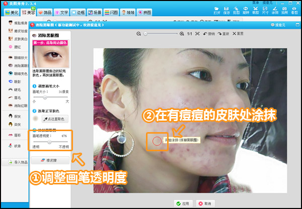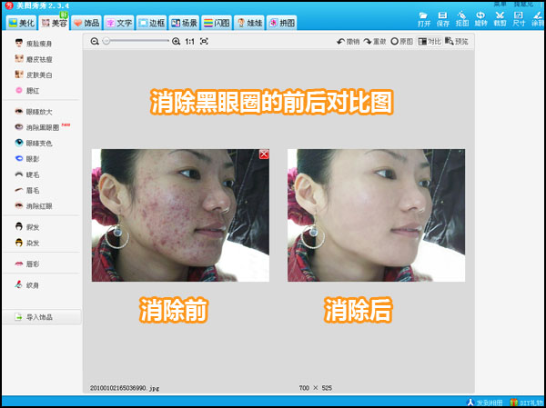 可以看出痘痘完全无影踪,肤质也变得嫩滑许多。接下来重点介绍“消除黑眼圈“这个功能的处理技巧: