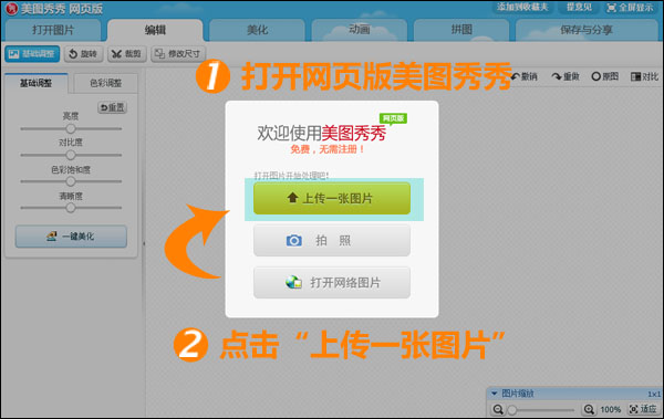 1.打开美图秀秀网页版(http://xiuxiu.web.meitu.com/),点击“上传一张图片”,上传需要美化的照片。