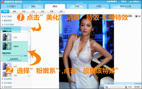 2.点击“美化”,选择“特效”里的“影楼特效”,选择“粉嫩系”特效,并点击“应用该特效”,使皮肤粉嫩。