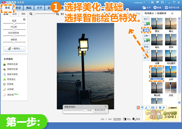1、在软件下打开待处理的照片,进入“美化”菜单下,选择“基础”分类,选择 “智能绘色”特效,提升照片色彩度。