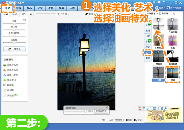 2、继续在“美化”菜单下,选择“艺术”分类,选择一键“油画”特效,一张仿佛需要千万次涂抹才能完工的油画尽显眼底。