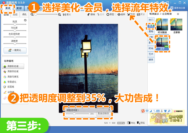 3、最后在“美化”菜单下,选择“会员”分类,选择“流年”特效,并把透明度调整到35%,适当调节一些自己喜欢的色调就大功告成啦~