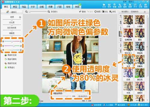 2、为打造小清新风格,可以适当地往绿色方向微调色彩参数,再选择“影楼”分类下的“冰灵”特效,为防止爆掉将特效透明度适当调低至80%。