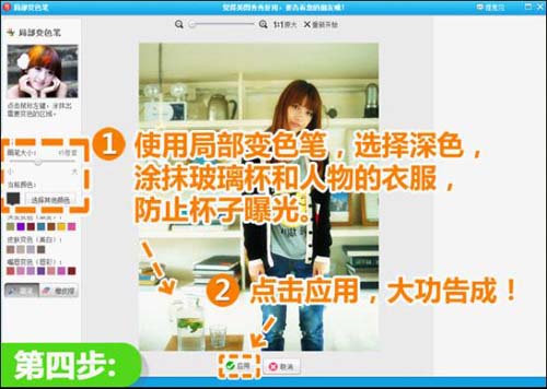 4、在整体提亮后,再处理照片上那些浅色部分,降低过曝的感觉,保持照片轮廓。在“美化”标签下,选择“局部变色笔”,选择深色涂抹那些过爆的部位,稍微修复一下即可完工咯!