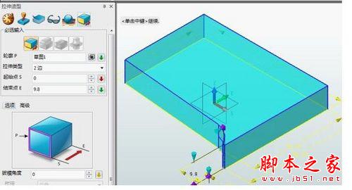 在基础造型工具栏单击拉伸命令,选择吊码盒草图线,在左侧的管理器窗口中参考下图输入相应的参数值,单击确定即可拉伸出实体(基体)模型(图3)。