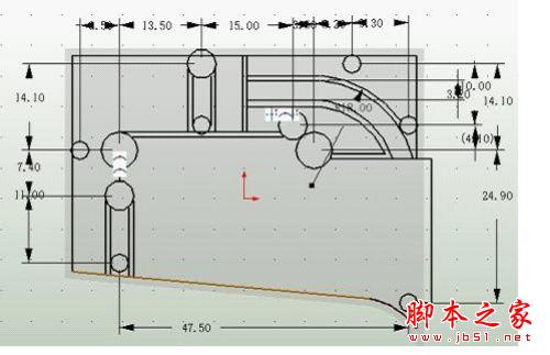 在工具栏单击“参考几何体”命令,鼠标左键点选吊码盒实体(基体)模型外沿轮廓线作为绘图基准,接着单击草图工具栏之“圆”的命令,绘制草图圆,按前文所述采用尺寸驱动技术以外沿轮廓线为基准,精确调整各个圆的位置和直径,并约束固定。然后采用直线、圆弧和偏移命令,绘制内部结构草图,并以外沿轮廓线和圆为基准,尺寸驱动精确调整草图线的位置。