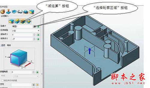 单击“拉伸”命令,点亮草图线,在左侧管理器窗口中,勾选“减运算”,点击“选择轮廓区域”按钮,接着鼠标左键在实体模型点亮需要拉伸的面,然后点确定返回,在左侧管理器窗口中参考下图输入相应的参数值,单击确定即可形成被挖空的实体模型(图5)。这里要着重说明一下“选择轮廓区域”的用途,当草图线条复杂且形成多个不同区域的面,有的面要拉伸,有的面不需要拉伸,怎么办?这就用到中望3D的“选择轮廓区域”功能了,只需点亮需要拉伸的面即可。另外,中望3D的“减运算”与中望CAD“差集”功能相同,唯名称不同。