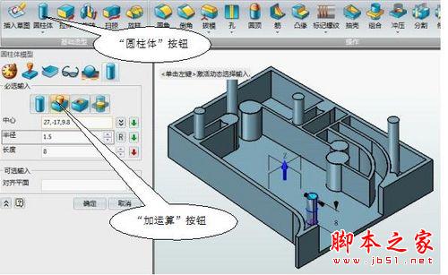单击基础建模之“圆柱体”命令,将光标移到实体模型点击圆的平面,单击鼠标右键出现对话框,点选“曲率中心”,然后再次点击圆的轮廓线自动捕捉圆的中心,然后在左侧的管理器窗口中勾选“加运算”,参考下图输入相应的参数值,点确定,结果如图6。