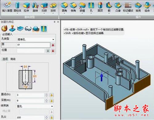 单击操作工具栏之“孔”的命令,在实体模型平面单击,轻轻移动鼠标自动捕捉到圆的中心点,再单击鼠标左键,并在左侧的孔的选项窗口中参考下图输入相应的参数值,点确定,结果如(图7)。
