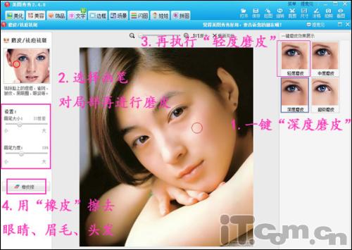 1、用“美图秀秀”软件打开素颜照片,在“美容”菜单下执行“磨皮去痘”操作。如图2所示的操作顺序,先进行一键“深度磨皮”后,接着调节好画笔的大小力度对一些局部细节处进行手动磨皮,再执行“轻度磨皮”,最后选择“橡皮擦”功能涂沫照片人物的眼睛、眉毛、头发,以保留五官的细节。