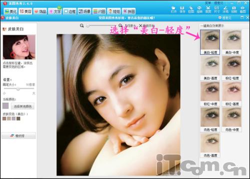 6、眼睛的部分处理完毕后,人物的皮肤仍偏红,于是在“美白”下选择一键式“美白-轻度”操作,如图7所示。