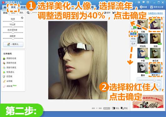 2、接着还是在“美化”菜单下,选择“人像”分类,点击“流年”特效并调整透明度为40%,点击“确定”。接着选择“粉红佳人”,透明度调整为100%,点击“确定”。