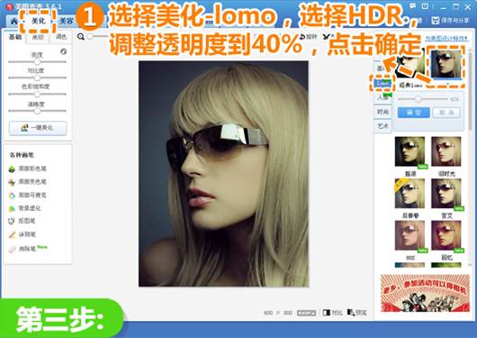 3、然后点击“LOMO”分类,选择“HDR”特效,调整透明度到40%,点击“确定”。