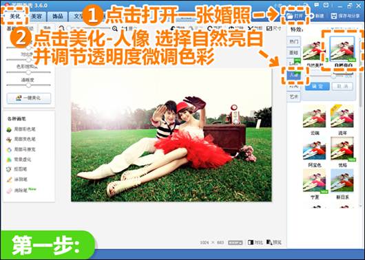 1、在“美图秀秀”软件下,打开一张婚照,为了后期的风格处理,适当的利用“美化”菜单下的特效,微调色彩,这里选择“人像”分类的“自然亮白”。