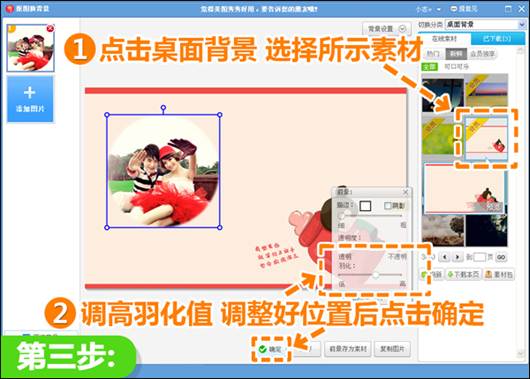 3、跳转到换背景界面下,点击“桌面背景”分类,选择如图所示的素材,调好前景的位置后并调高羽化值。
