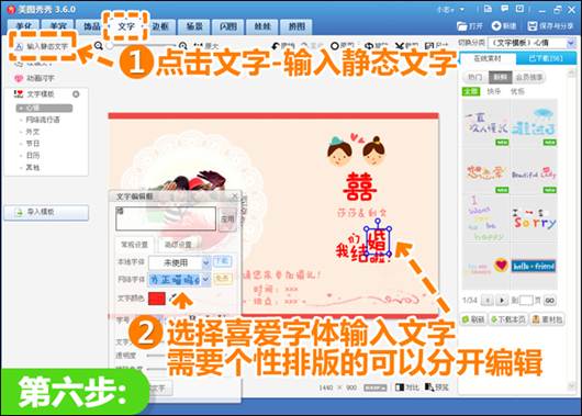 6、再进入“文字”菜单下,点击“输入静态文字”后选择漂亮的网络字体,在文本框中输入相应的请柬文字,需要个性排版的效果可以将文字分开编辑。