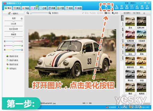第一步:用美图秀秀打开要处理的图片后,点“美化”菜单。