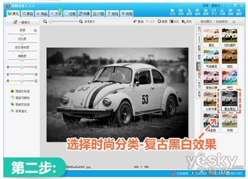 第二步:在“时尚”标签里,选择“复古黑白”特效。