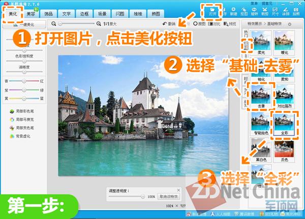 1、在软件下打开待处理的照片,进入“美化”菜单下,选择“基础-去雾”和“全彩”特效,使照片消除朦胧感。