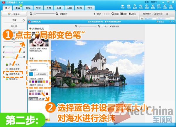 2、点击“局部变色笔”,选择合适的蓝色并调节画笔大小,对水面进行涂抹,使水面颜色更加真实。