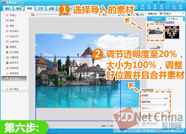 6、将素材透明度调至20%,素材大小调至100%,摆放到合适位置后右键选择合并,轻松添加照片倒影。
