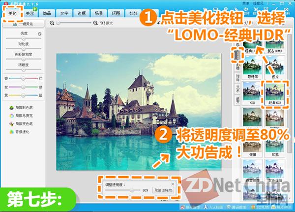7、最后为了使素材融合的更好,还需要为照片添加一些特效。进入美化菜单,选择“LOMO-经典HDR”,并将透明度调至80%,大功告成!