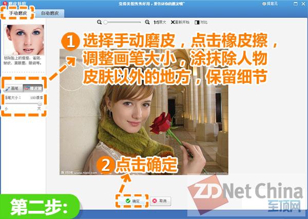 2、接着选择“手动磨皮”,点击橡皮擦,调整合适的画笔大小,涂抹除人物皮肤以外的地方,使宫殿以及人物的头发、衣服的细节得以保留。