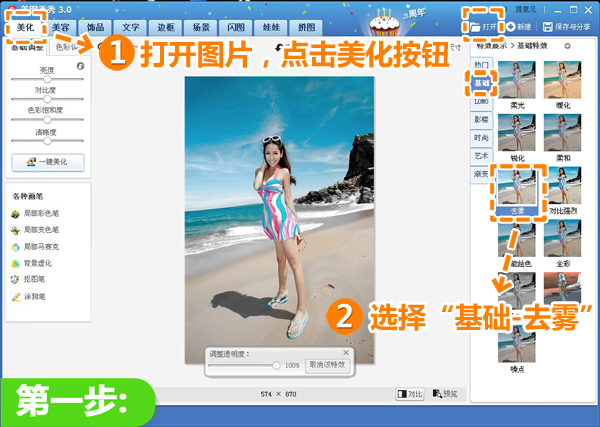 1、在软件下打开待处理的照片,进入“美化”标签下,选择“基础-去雾”特效,轻松使照片消除朦胧感。