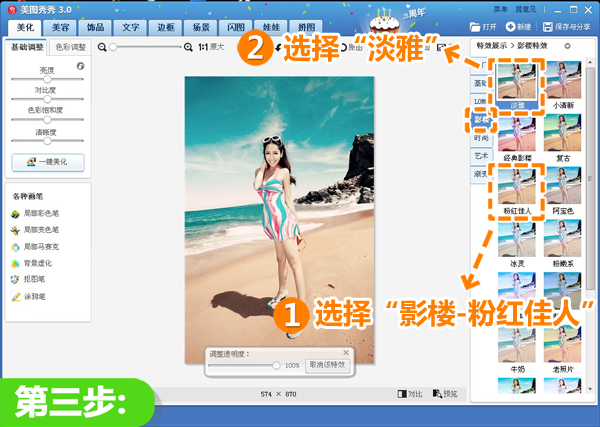 3、点击“影楼-粉红佳人”特效,再点击“淡雅”特效,赋予照片复古气息。