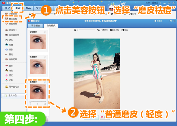 4、进入“美容”标签下,选择“磨皮祛痘-普通磨皮-轻”,使人物肤质更有质感。