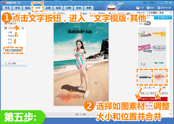 5、点击“文字”标签,进入“文字模版-其他”,选择如图素材,调整素材大小和位置并右键选择合并,为照片增加时尚海报元素。
