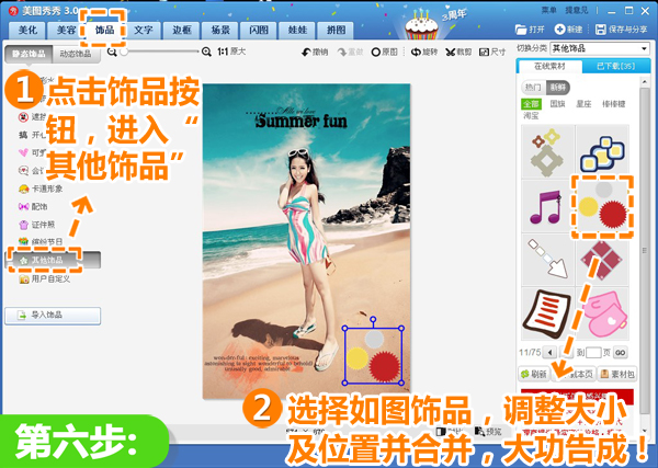 6、点击“饰品”标签,进入“其他饰品”,选择如图饰品,调整饰品大小及位置,右键选择合并,至此复古的沙滩海报就轻松完成了!