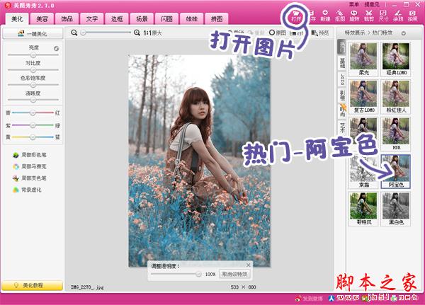 第一步:在“美图秀秀”软件下打开一张图片。在“美化”菜单下选择“热门—阿宝色”,给照片赋予淡橘色的人物肤色和偏青色的背景色调。
