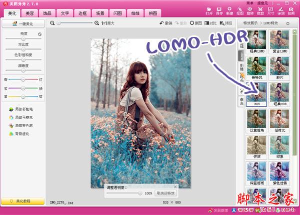第四步:选择“LOMO—经典HDR”,适当的调节透明度,让效果看起来更自然。