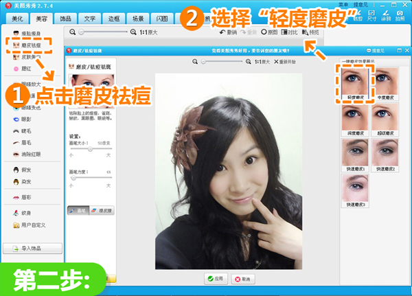 2、点击“磨皮祛痘”,选择“轻度磨皮”,使照片降噪,提高照片质量。