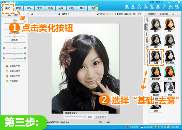 3、点击“美化”菜单,选择“基础-去雾”特效,让照片甩掉灰暗。
