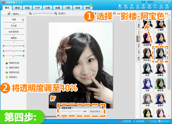 4、选择“影楼-阿宝色”,并将透明度调至40%,使皮肤看起来比较白皙。