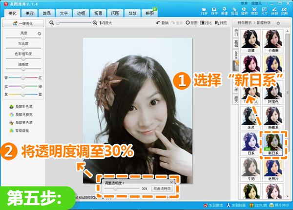 5、然后选择“新日系”,并将透明度调至30%,使照片亮度减小。